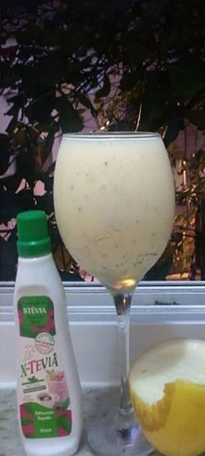 Agregar XTEVIA COM SABOR DE AÇÚCAR (aprox. 30-40 gotas de adoçante). Ligar o liquidificador. Se deve provar o resultado final, para avaliar se está bem doce. Considerar que quando se leva à geladeira, devido ao frio, o efeito doce vai diminuir, portanto a mistura no liquidificador deve ser bem doce.